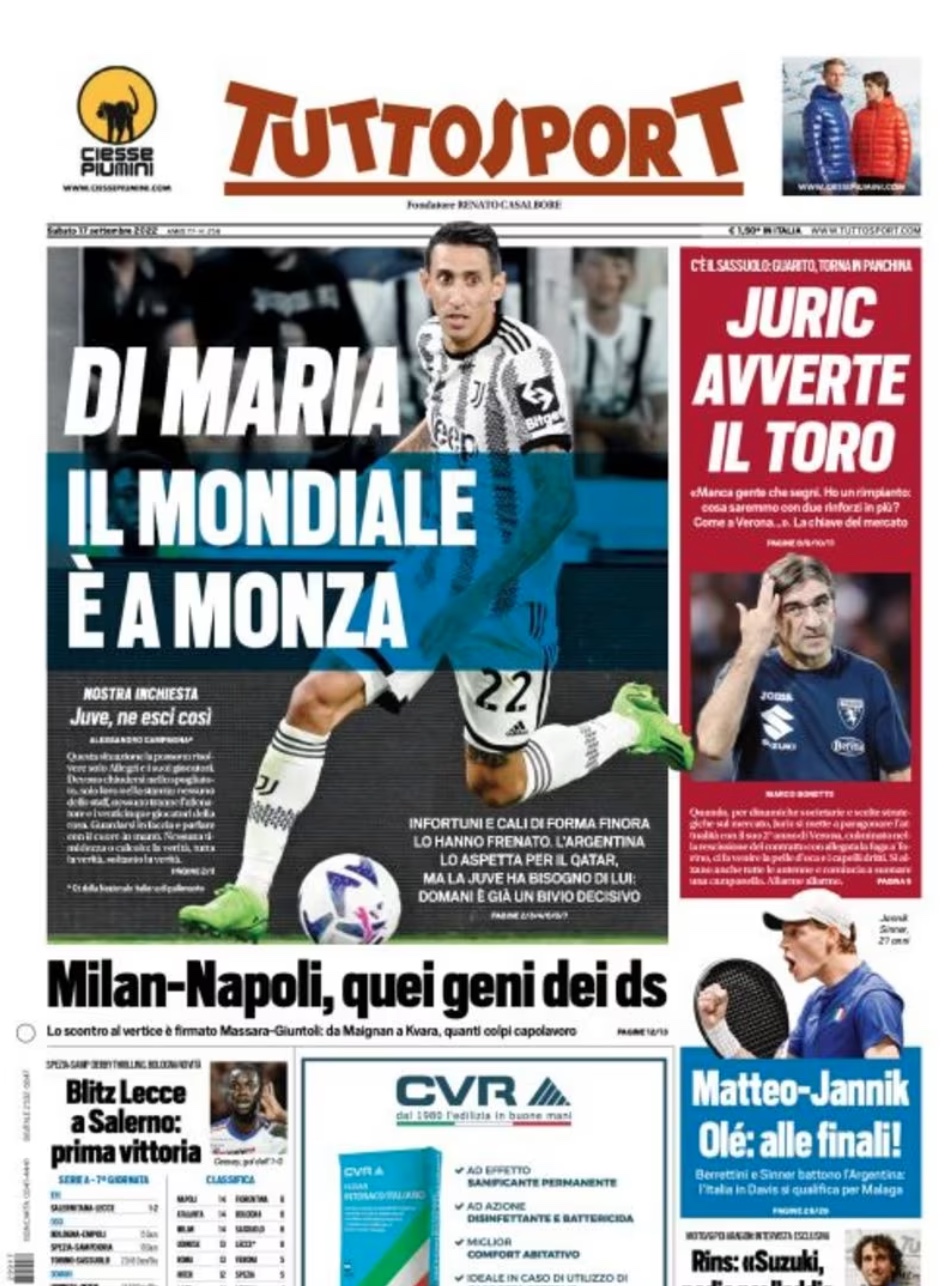 "Di Maria, il Mondiale è a Monza" scrive Tuttosport in apertura quest'oggi. Infortuni e cali di forma fino a questo momento hanno frenato El Fideo, l'Argentina lo aspetta in Qatar, ma la Juventus ha bisogno di lui per superare questo difficile momento. Domani contro il Monza è già un bivio decisivo per il club bianconero.