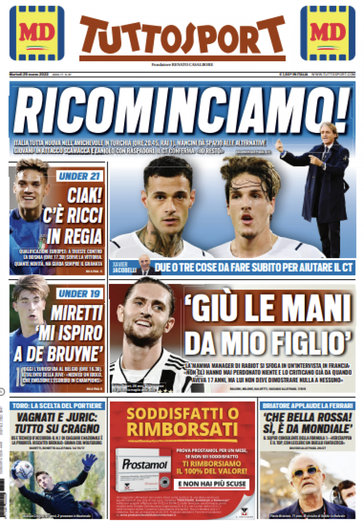 “Ricominciamo”, è questa l’apertura di Tuttosport che apre con la Nazionale italiana e con Scamacca e Zaniolo, i volti per la nuova Italia. Spazio anche al caso Rabiot, difeso ancora una volta dalla madre pubblicamente: "Giù le mani da mio figlio".