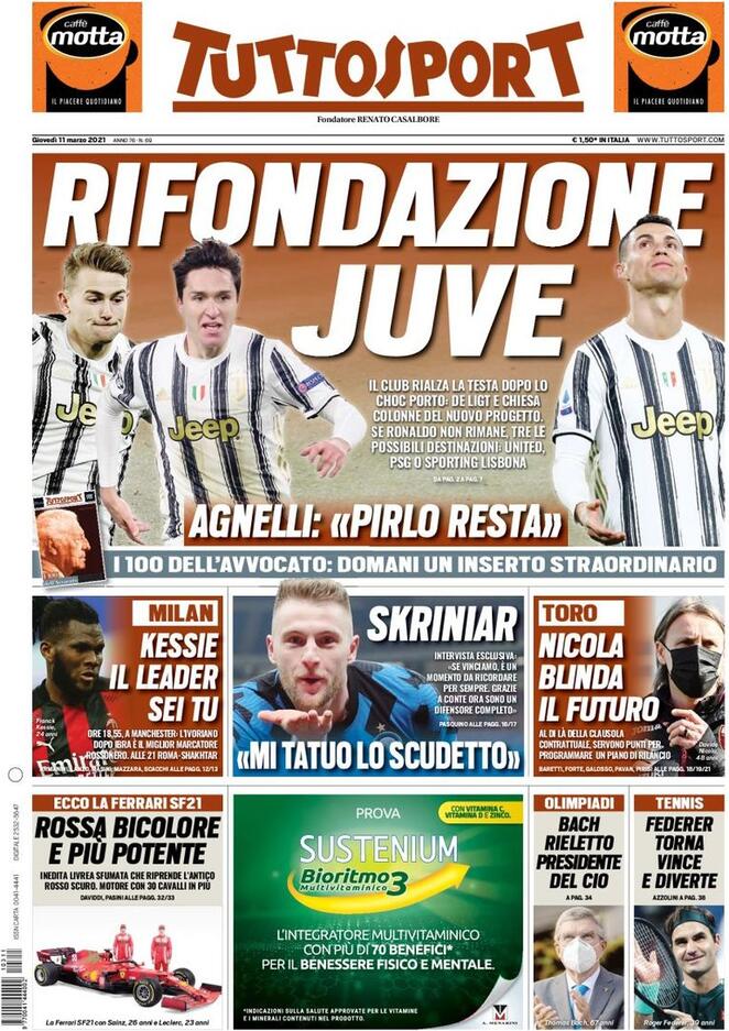 Nell'edizione di oggi Tuttosport apre in prima pagina con la ripartenza del progetto bianconero dopo l'eliminazione dalla Champions League: "Rifondazione Juve. De Ligt e Chiesa colonne del nuovo progetto. Se Ronaldo non rimane tre le possibili nuove destinazioni: United, Psg o Sporting Lisbona". Al centro le dichiarazioni del difensore dell'Inter in caso di vittoria del campionato: "Skriniar: 'Mi tatuo lo scudetto'".