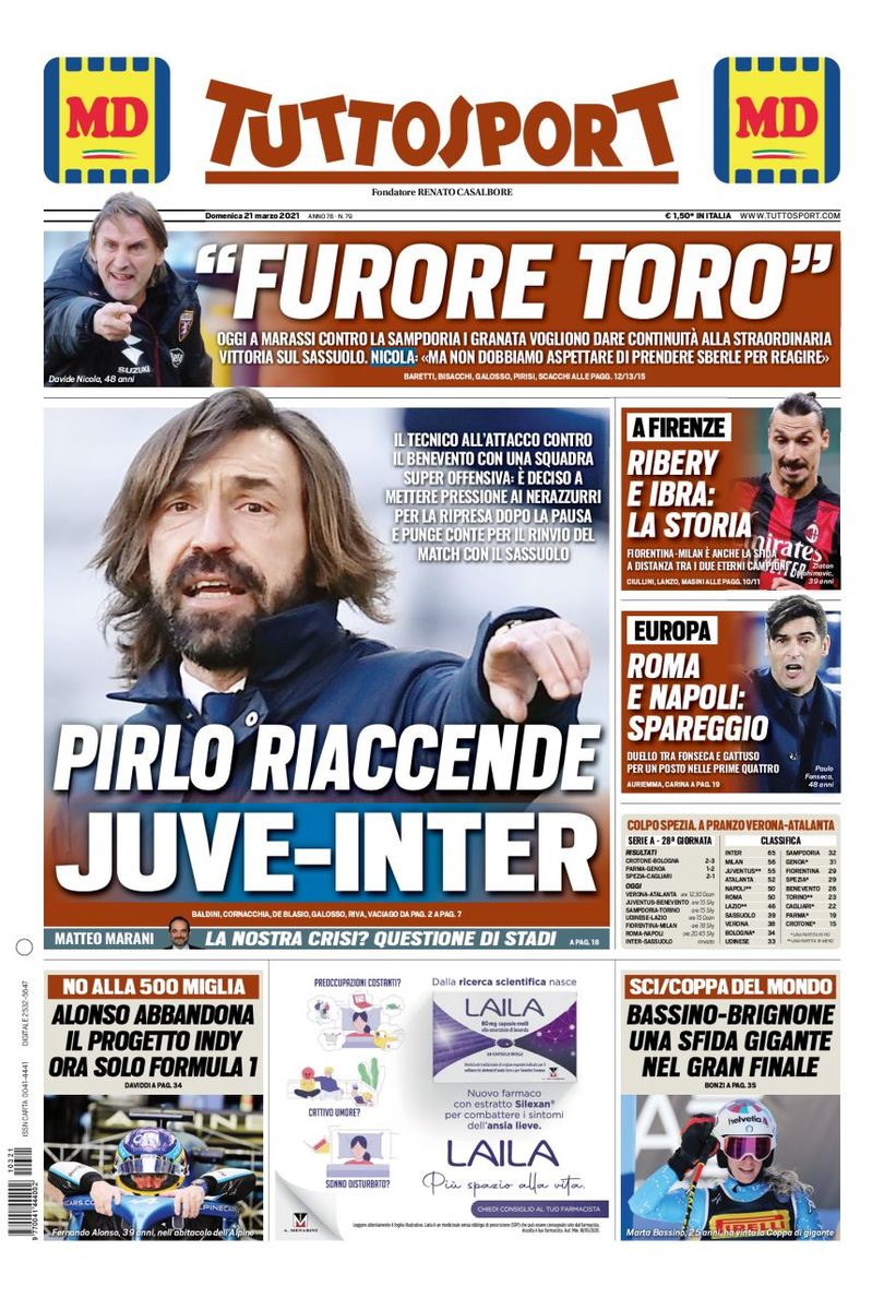Titola così in prima pagina Tuttosport, nell'edizione di oggi: "Roma e Napoli: spareggio. Duello tra Fonseca e Gattuso per un posto tra le prime quattro". A centro pagina spazio alle dichiarazioni del tecnico bianconero sul rinvio di Inter-Sassuolo: "Pirlo riaccende Juve-Inter". In alto spazio al Torino alla ricerca di punti salvezza nella sfida di oggi a Marassi contro la Sampdoria: "Furore Toro".