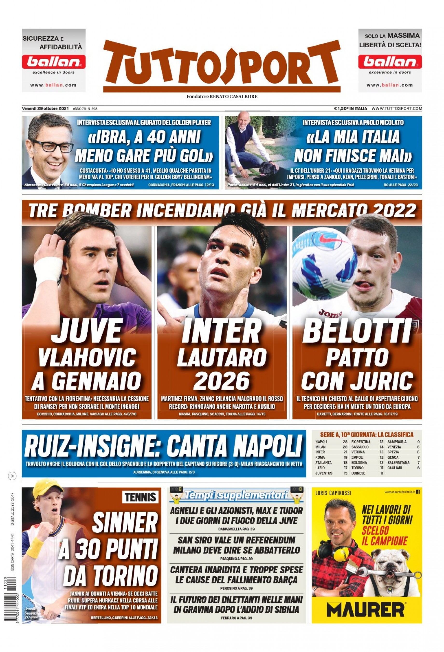 Tuttosport dedica l’apertura al 3-0 del Napoli ai danni del Bologna e il primato in classifica a pari punti con il Milan: “Ruiz-Insigne: canta Napoli. Travolto anche il Bologna con il gol dello spagnolo e la doppietta del capitano su rigore. Milan agganciato in vetta". In alto si parla di calciomercato e in particolare del futuro di Vlahovic, Belotti e Lautaro Martinez.