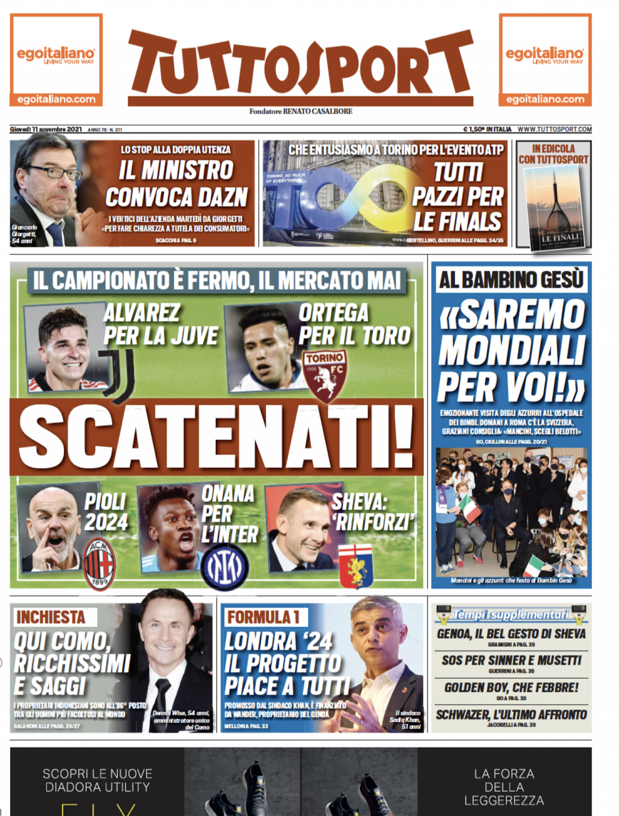 Tuttosport dedica l’apertura al calciomercato e alle mosse delle squadre italiane: "Alvarez per la Juve, Ortega per il Toro, Pioli 2024, Onana per l'Inter, Sheva 'rinforzi'". In taglio alto il caso Dazn: "Lo stop alla doppia utenza. Il ministro convoca Dazn". Di spalla la visita della Nazionale all'ospedale Bambino Gesù: "Saremo Mondiali per voi!".