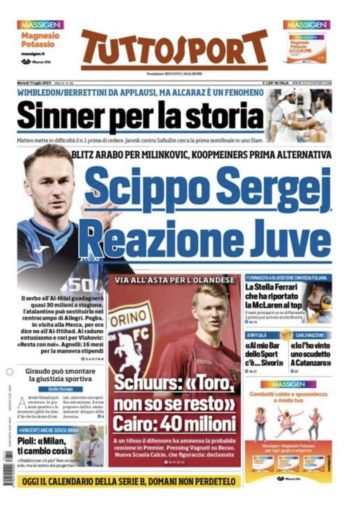 “Scippo Sergej. Reazione Juve”. Titola così al centro l’edizione odierna di Tuttosport: “Blitz arabo per Milinkovic, Koopmeiners prima alternativa”. In taglio basso le parole di Perr Schuurs: "‘Toro, non so se resto’. Cairo: 40 milioni”.