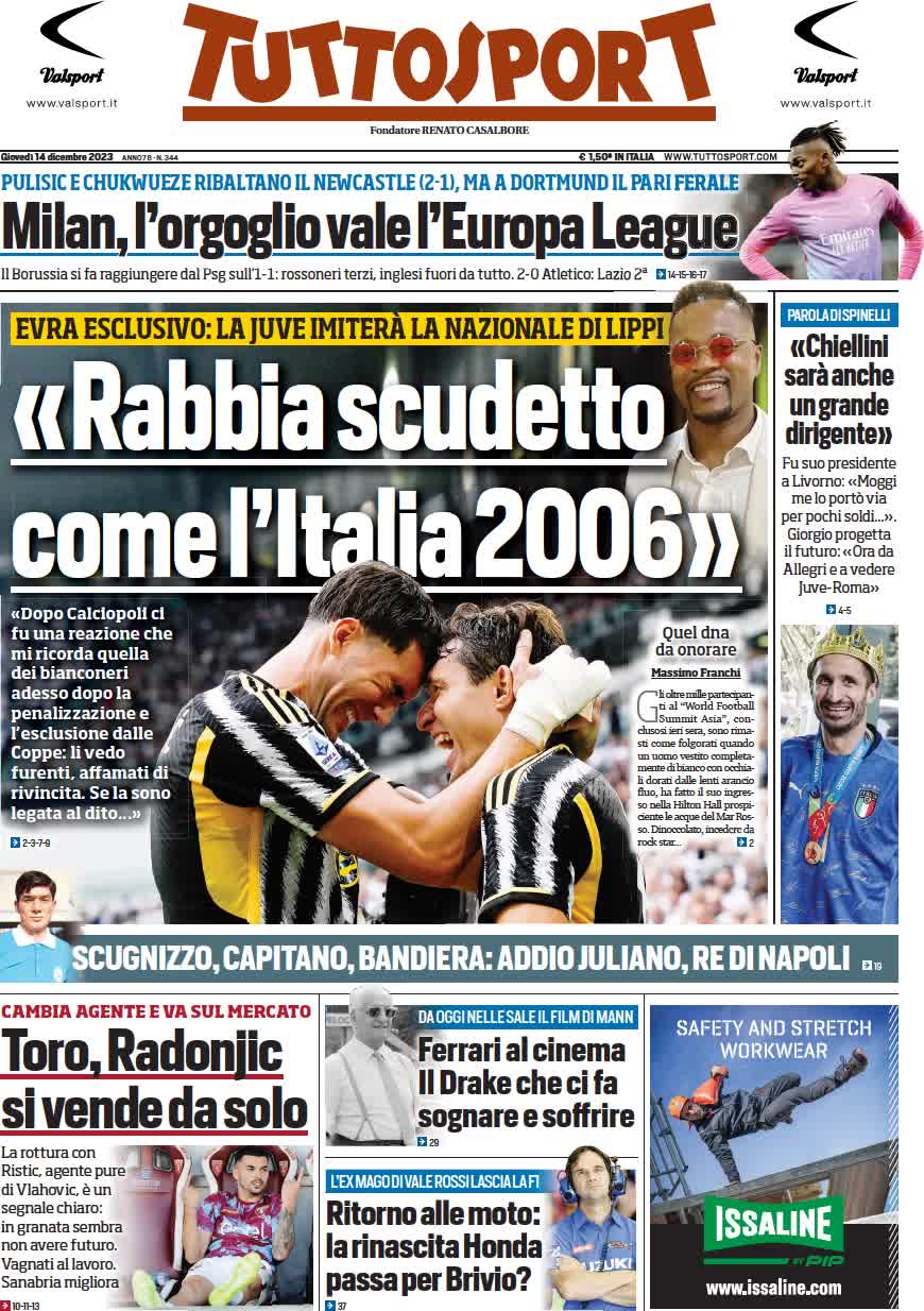 "Rabbia Scudetto come l'Italia del 2006". Titola così in prima pagina il quotidiano, soffermandosi sulle parole di Patrice Evra che ha rilasciato un'intervista parlando delle ambizioni della Juventus. Secondo l'ex difensori i bianconeri proveranno ad imitare l'Italia di Marcello Lippi nella conquista dello Scudetto. Un paragone dovuto alla grande voglia di riscatto della Juve, affamata di rivincita e consapevole di dover lottare tanto contro l'Inter per vincere il titolo.