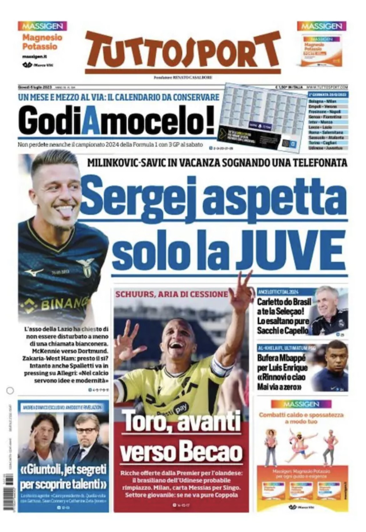 “Sergej aspetta solo la Juve”. Titola così al centro l’edizione odierna di Tuttosport: "Milinkovic-Savic in vacanza sognando una telefonata". Al centro spazio anche al mercato del Torino: "Avanti verso Becao". Di spalla Ancelotti, che diventerà commissario tecnico del Brasile dal 2024.