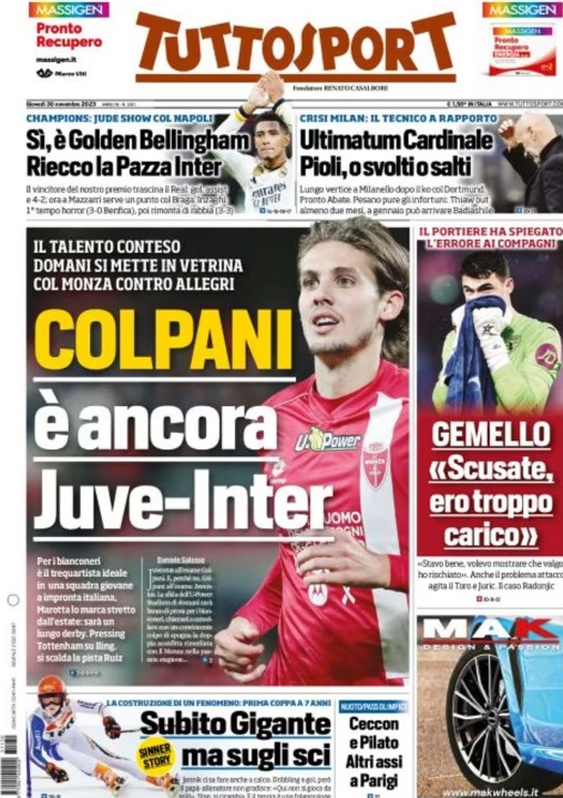 Tuttosport, in prima pagina nell'edizione di oggi si sofferma sulle gare di Champions League di ieri: "Sì, è Golden Bellingham. Riecco la pazza Inter". In apertura spazio per il calciomercato: "Colpani, è ancora Juve-Inter. Il talento conteso". In taglio alto la panchina di Pioli in bilico: "Ultimatum Cardinale: Pioli o svolti o salti".