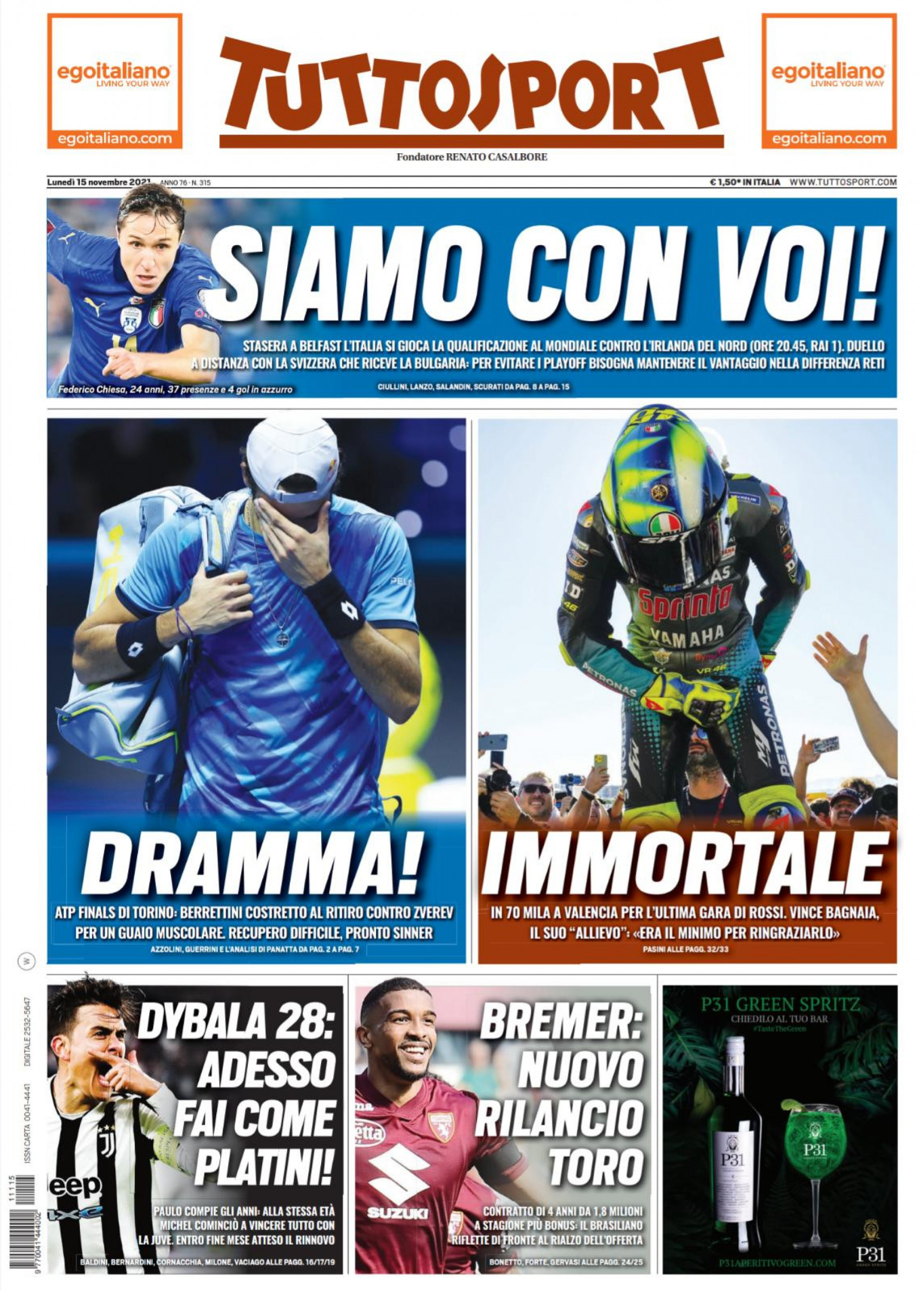 Tuttosport, nell'edizione di oggi, apre in prima pagina con la gara decisiva per l'Italia di Mancini: "Stasera a Belfast l'Italia si gioca la qualificazione al Mondiale contro l'Irlanda del Nord (ore 20.45, Rai 1). Duello a distanza con la Svizzera che riceve la Bulgaria. Per evitare i playoff bisogna mantenere il vantaggio nella differenza reti". In taglio basso spazio al mercato del Torino: "Bremer, nuovo rilancio Toro".