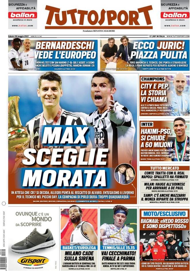 PRIMA PAGINA - Tuttosport: "Spalletti ha firmato! Hakimi va al Psg"