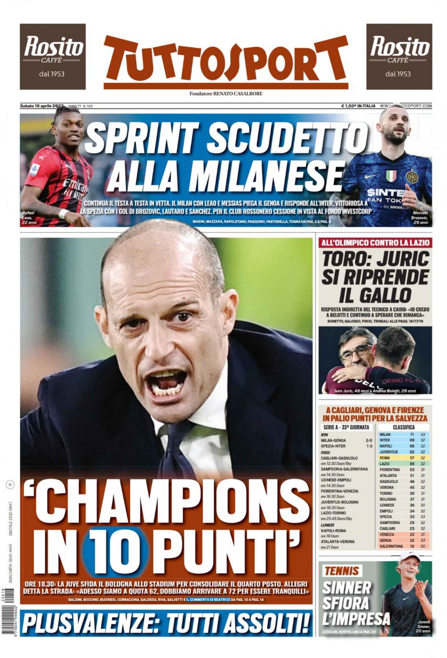 “Sprint scudetto alla milanese”, è questa l’apertura di Tuttosport che apre con i risultati di Inter e Milan in chiave scudetto. "Continua il testa a testa in vetta. Il Milan con Leao e Messias piega il Genoa e risponde all'Inter, vittoriosa a La Spezia con gol di Brozovic, Lautaro e Sanchez". Al centro le dichiarazioni di Allegri sulla Juventus: "Champions in 10 punti". Sulla destra spazio anche per il Torino: "Toro: Juric si riprende il Gallo".