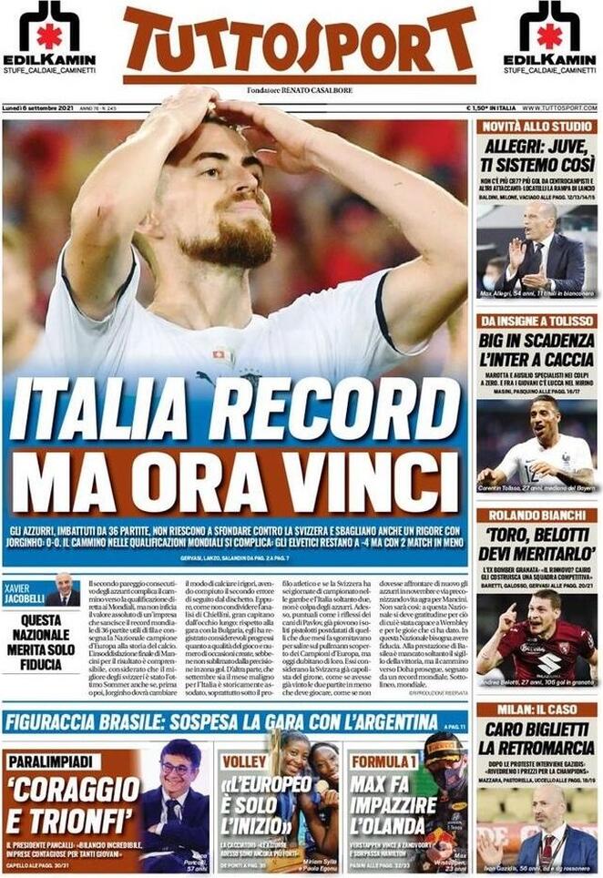 "Italia record ma ora vinci" scrive Tuttosport in apertura sulla Nazionale, bloccata ieri in Svizzera sullo 0-0. Gli Azzurri, imbattuti da 36 partite consecutivamente (record come il Brasile), non riescono a sfondare contro la Svizzera e falliscono anche un calcio di rigore con Jorginho. Il cammino verso le qualificazioni Mondiali si complicano: gli elvetici restano a -4 ma con due gare in meno.