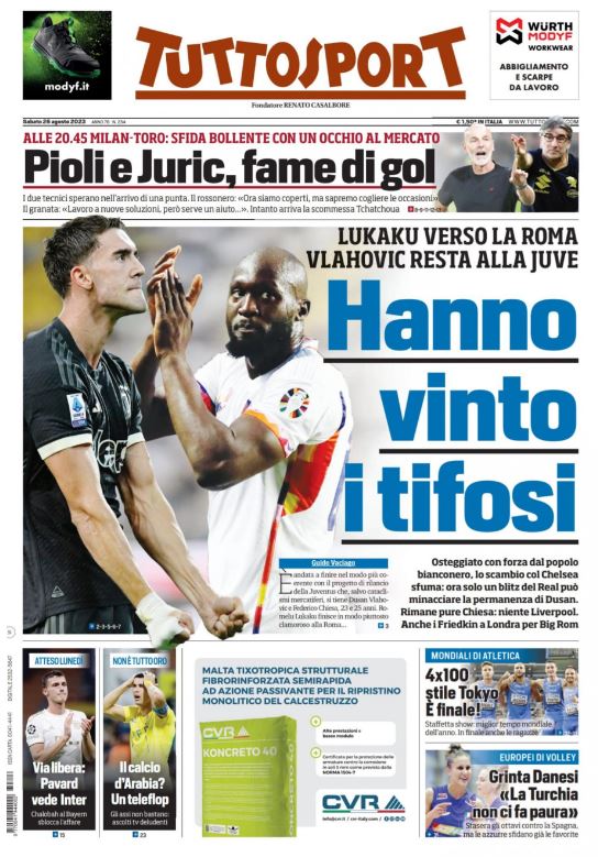 PRIMA PAGINA - Tuttosport su Lukaku-Roma e Juve-Vlahovic: "Hanno vinto i tifosi"