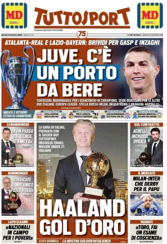 L'edizione odierna di Tuttosport apre in prima pagina con i sorteggi di Champions League, andati in scena ieri. "Juve c'è un porto da bere", titola il quotidiano sui bianconeri. Sorteggio abbordabile per la Juventus, mentre saranno sfide durissime per le altre due italiane: Lazio contro il Bayern Monaco e Atalanta contro il Real Madrid. In Europa League invece la Roma trova il Braga, mentre il Napoli pesca il Granada ed il Milan la Stella Rossa.