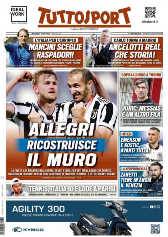 "Allegri ricostruisce il muro". Apre così Tuttosport in edicola, spiegando che la Juventus di Max ripartirà dalla difesa e dal giovane de Ligt e il veterano Chiellini. In taglio alto la decisione di Roberto Mancini di tenere fuori Politano in favore di Raspadori: "Mancini sceglie Raspadori!"