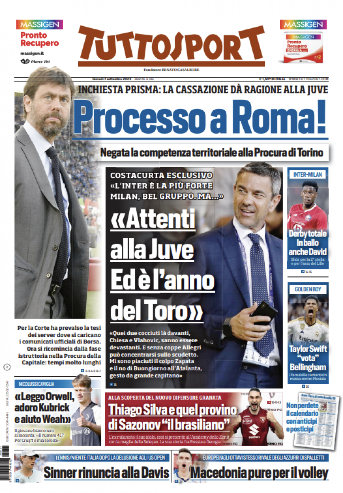 L'edizione odierna di Tuttosport apre in prima pagina con la Juventus e lo spostamento dell'Inchiesta Prisma: "Processo a Roma!". Al centro l'intervista ad Alessandro Billy Costacurta, mentre di spalla il duello di mercato tra Inter e Milan per David del Lille. In basso il Torino: "Thiago Silva e quel provino di Sazonov 'il brasiliano'".