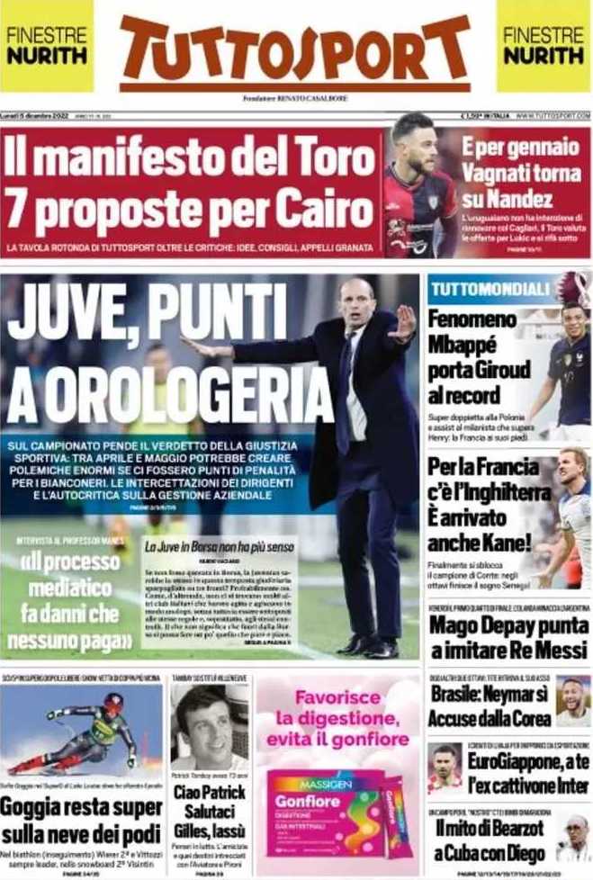 Juve, punti ad orologeria, titola il quotidiano torinese Tuttosport in merito al possibile verdetto della giustizia sportiva: "Tra aprile e maggio potrebbe creare polemiche enormi se ci fossero punti di penalità per i bianconeri".