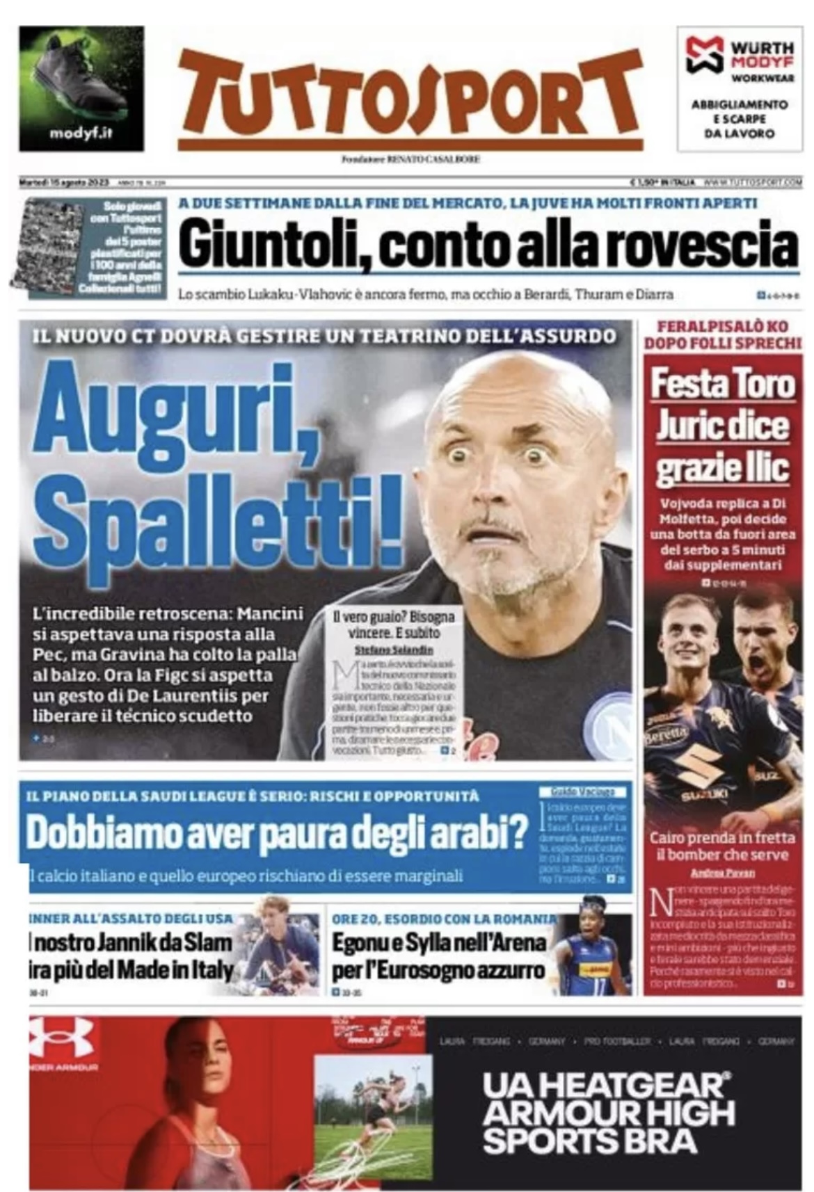 "Auguri, Spalletti!". È questo il titolo di apertura di Tuttosport. Il nuovo commissario tecnico, si legge, dovrà gestire un teatrino dell'assurdo. Si apprende anche un retroscena: Mancini si aspettava una risposta alla pec, ma Gravina ha colto la palla al balzo.