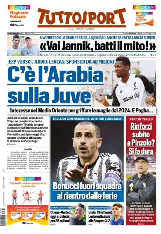 "C'è l'Arabia sulla Juve". E' questo il titolo d'apertura di Tuttosport. Con Jeep verso l'addio, il club bianconero cerca un nuovo sponsor per griffare le maglie nel 2024 che sia disposto a mettere sul piatto 40 milioni. Spazio anche al caso Bonucci: "Bonucci fuori squadra al rientro dalle ferie".