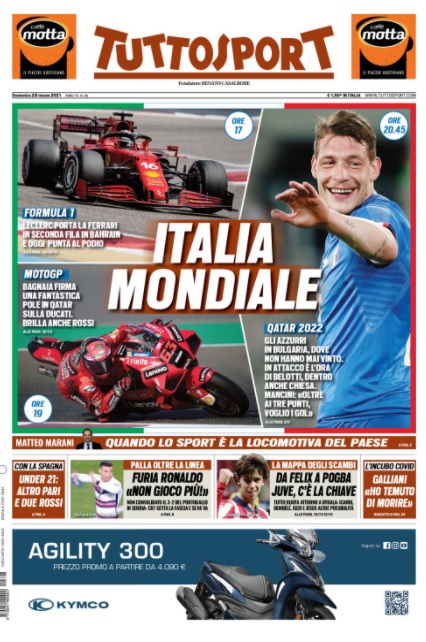 "Italia Mondiale". Questo il titolo in prima pagina dell'edizione odierna di Tuttosport. La Nazionale di Roberto Mancini questa sera sarà impegnata in Bulgaria nel secondo turno del Gruppo C di qualificazione al Mondiale di Qatar 2022. Non solo. Oggi sarà anche il giorno della partenza del campionato del mondo di Formula 1 e del Motomondiale.