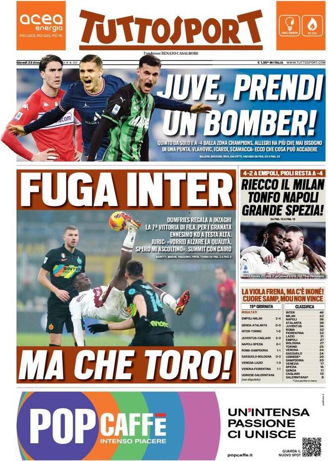 Nell'edizione di oggi Tuttosport titola in prima pagina: "Tonfo Napoli, grande Spezia!". A centro pagina spazio alla vittoria dell'Inter, sempre più capolista, contro il Torino: "Fuga Inter, ma che Toro!". Di spalla spazio alla vittoria del Milan in trasferta: "Riecco il Milan. 4-2 a Empoli, Pioli resta a -4". In taglio alto spazio al mercato di gennaio: "Juve, prendi un bomber!".