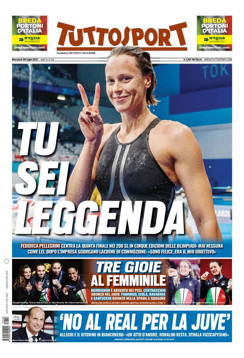 Tuttosport dedica l'apertura in prima pagina dell'edizione odierna a Federica Pellegrini: "Tu sei leggenda. Centra la quinta finale nei 200 sl in cinque edizioni delle Olimpiadi: mai nessuna come lei". Più in basso spazio alle tre medaglie olimpiche conquestate dall'Italia ieri: "Tre gioie al femminile". In taglio basso spazio alle dichiarazioni di Allegri: "No al Real per la Juve".