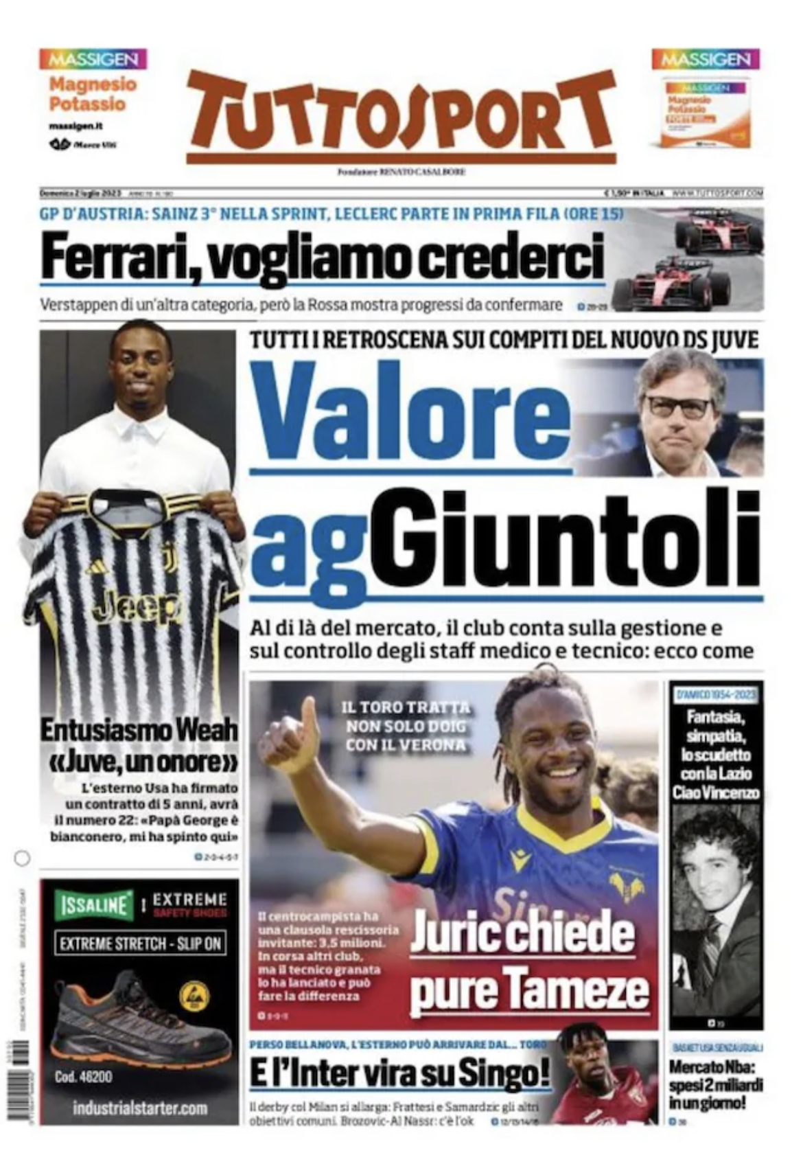 “Valore agGiuntoli”. Titola così al centro l’edizione odierna di Tuttosport. "Tutti i retroscena sui compiti del nuovo ds Juve. Al di là del mercato, il club conta sulla gestione e sul controllo degli staff medico e tecnico: ecco come". Sulla sinistra spazio alle prime parole di Timothy Weah da nuovo giocatore della Juventus, menyre in basso l'Inter: "Virata su Singo!".