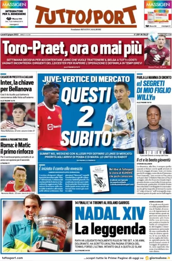 Nell'edizione di oggi Tuttosport apre in prima pagina con il vertice del mercato in casa Juventus: "Questi 2 subito. Summit nel weekend con Allegri per definire le linee di mercato: Priorità agli arrivi di Pogba e Di Maria. Lo United su Rabiot". In taglio alto spazio al rinnovo del belga del Torino: "Toro-Praet, ora o mai più". Di spalla il primo colpo della Roma di Mourinho: "Roma: è Matic il primo rinforzo".