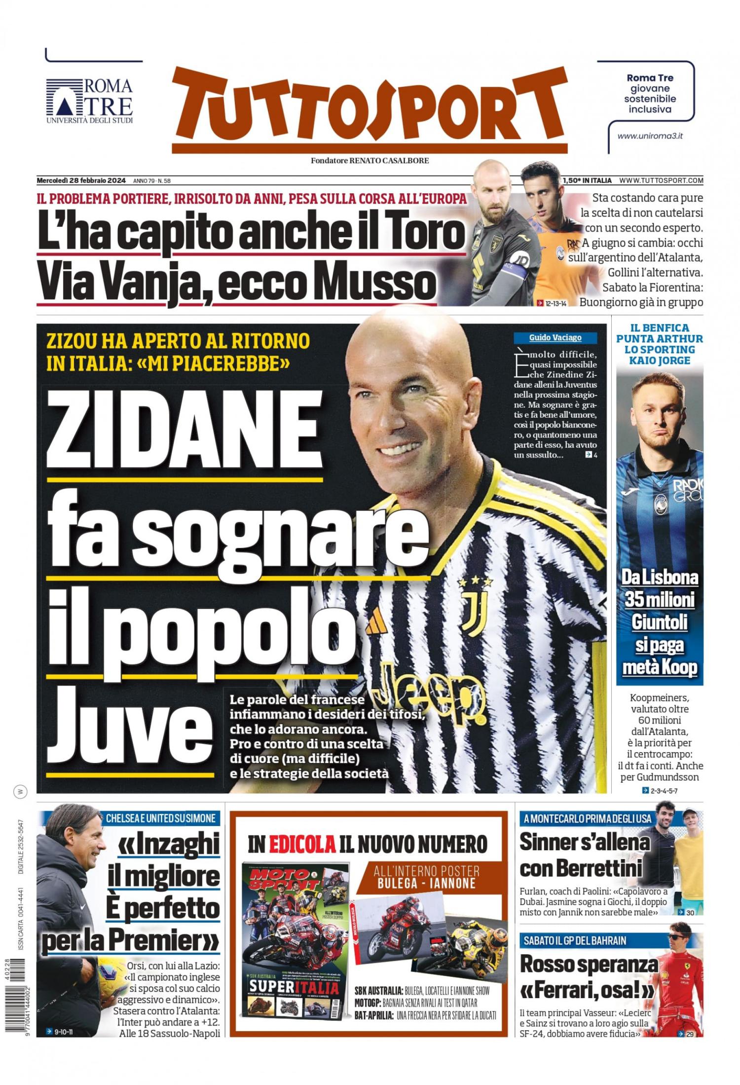 Tuttosport, nell'edizione odierna, apre in prima pagina con la suggestione Zidane alla Juventus dopo alcune dichiarazioni rilasciate a Roma dall'ex tecnico del Real Madrid: "Zidane fa sognare il popolo Juve. Zizou ha aperto al ritorno in Italia: 'Mi piacerebbe'". In taglio alto spazio al mercato del Torino: "Anche il Toro l'ha capito. Via Vanja, ecco Musso". Di spalla ancora mercato, stavolta della Juventus: "Da Lisbona 35 milioni. Giuntoli si paga metà Koop".