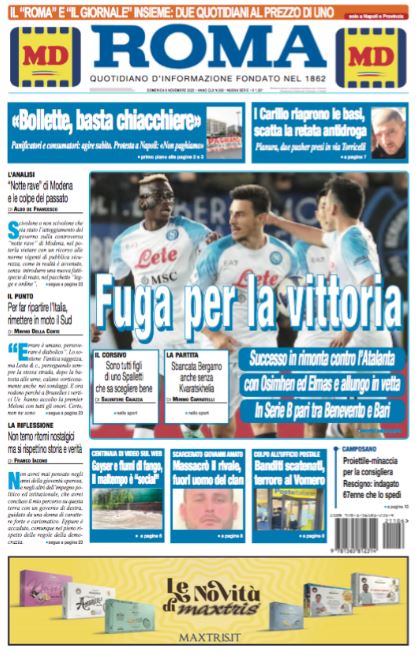 "Fuga per la vittoria". E' questo il titolo d'apertura dell'edizione odierna de Il Roma, all'indomani del nono successo di fila del Napoli in campionato, stavolta sul campo dell'Atalanta e in rimonta, grazie al solito Victor Osimhen ma pure ad Eljif Elmas, autore della rete decisiva per il 2-1 finale.