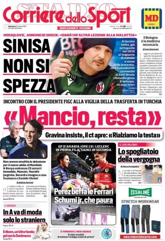 Il Corriere dello Sport oggi in edicola dedica il titolo principale ancora alla Nazionale, con le parole di Gabriele Gravina: "Mancio, resta". Alla vigilia della trasferta in Turchia l'incontro tra il commissario tecnico e il presidente FIGC, che insiste per andare avanti con Roberto Mancini.