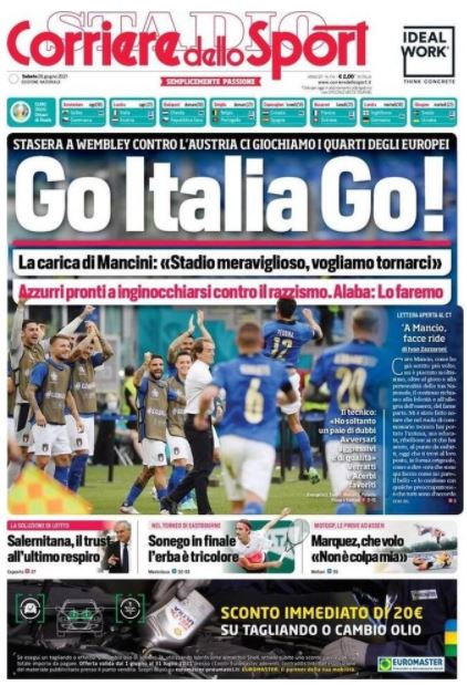 L'edizione odierna del Corriere dello Sport apre in prima pagina con il titolo: "Go Italia Go". Stasera a Wembley contro l'Austria ci giochiamo l'accesso ai quarti di finale. La carica di Mancini: "Stadio meraviglioso, vogliamo tornarci". Questa sera gli Azzurri sono pronti ad inginocchiarsi contro il razzismo, così come lo farà l'Austria ed il suo capitano David Alaba.