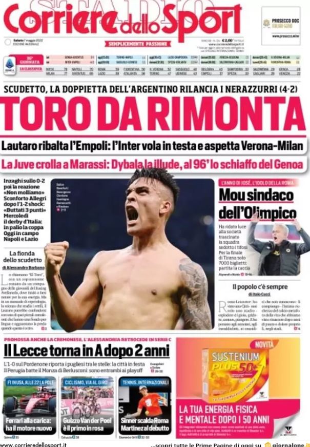 "Toro da rimonta". E' questo il titolo d'apertura del Corriere dello Sport all'indomani del successo dell'Inter sull'Empoli. Vetta in classifica temporanea, in attesa del Milan. "Mou sindaco dell'Olimpico", il titolo dedicato invece alla Roma.
