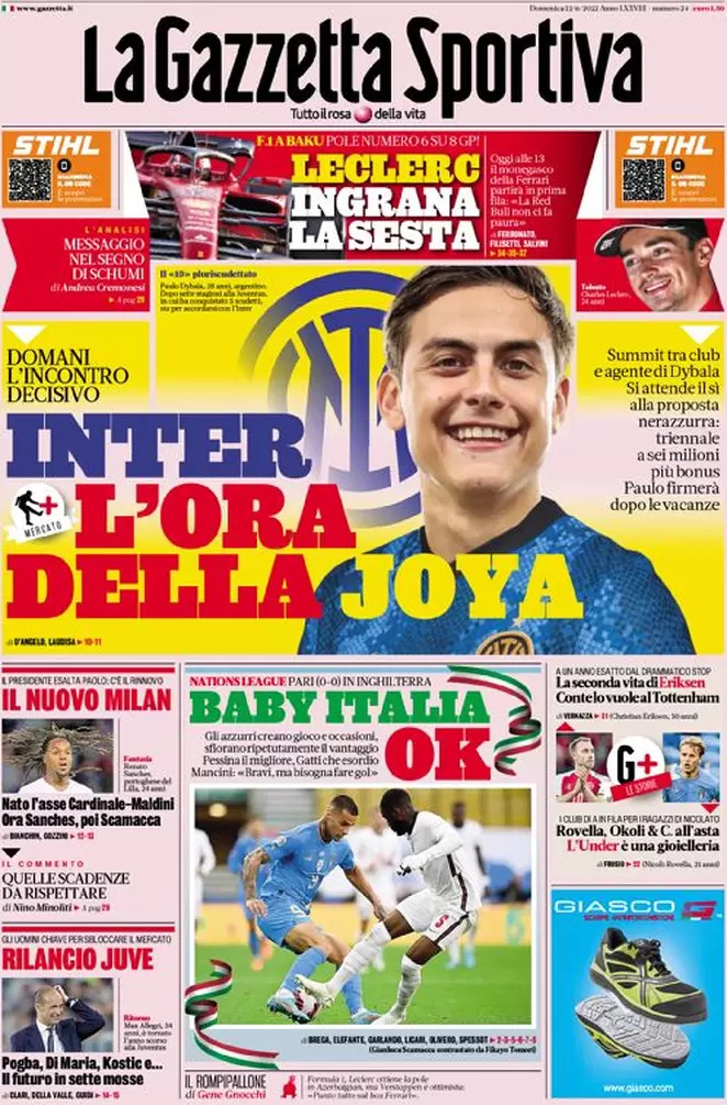 "Inter, l'ora della Joya", titola in apertura l'edizione odierna de La Gazzetta dello Sport. Avanti tutta per il trasferimento in nerazzurro della Joya: domani è in agenda l'incontro decisivo. Summit tra il club e l'agente dell'argentino, si attende il sì alla proposta di Marotta: triennale a sei milioni più bonus. Paulo firmerà dopo le vacanze.