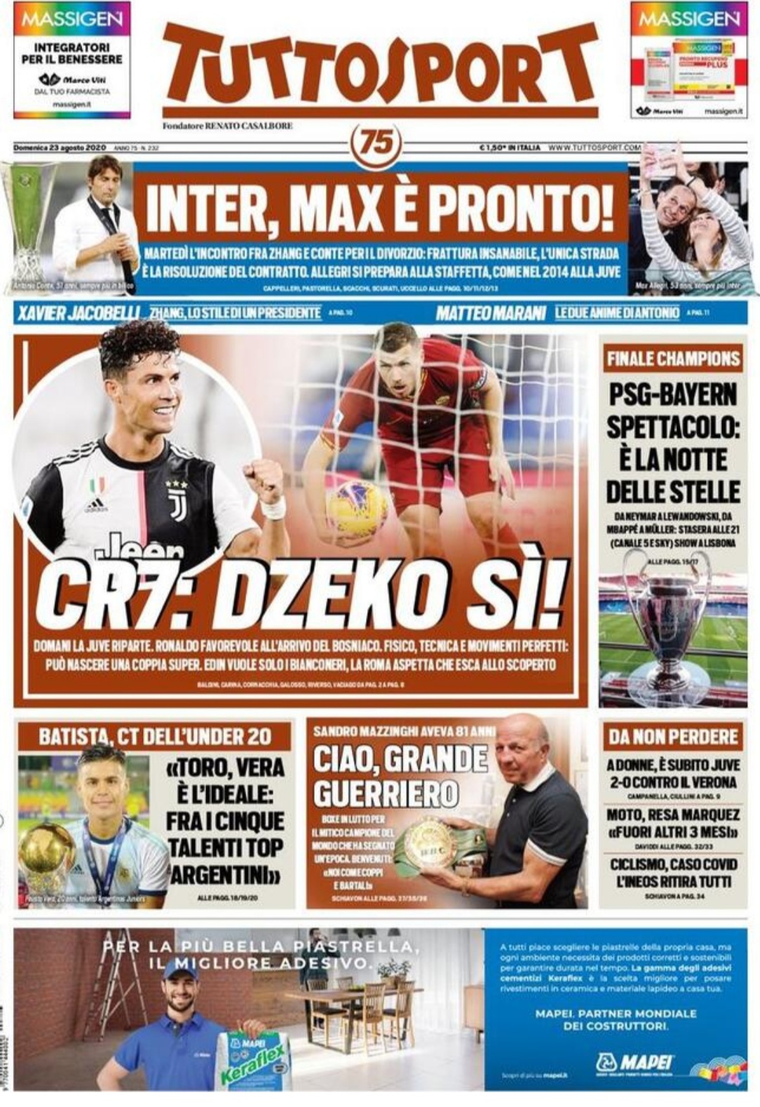 "CR7: Dzeko sì". È questo il titolo d'apertura di Tuttosport, che in prima pagina racconta del parere favorevole di Cristiano Ronaldo all'eventuale acquisto di Edin Dzeko (e non di Arkadiusz Milik) per l'attacco. In taglio alto il futuro della panchina dell'Inter: "Inter, Max è pronto", si legge in riferimento ad Allegri.