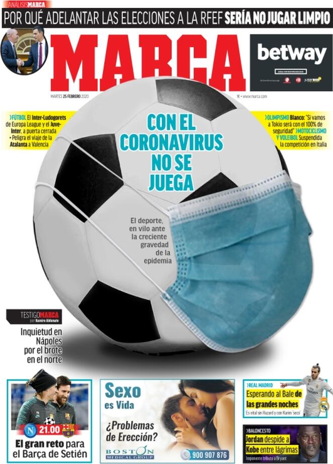 In Spagna tiene banco, ovviamente, il big match di stasera che vedrà di fronte Barcellona e Napoli. Il quotidiano spagnolo Marca apre in prima pagina dando maggiormente spazio all'emergenza Coronavirus e come questa sta condizionando il calcio in tutto il mondo, compresa ovviamente l'Italia. Spazio, poi, alla sfida del Napoli con "la grande sfida per il Barça di Setièn".