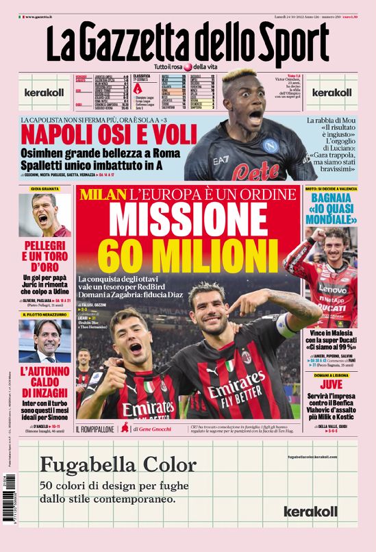 Solo in taglio alto finisce il Napoli nella prima pagina della Gazzetta dello Sport dopo la vittoria di Roma. La rosea titola nell'edizione di oggi: "Napoli Osi e voli. Osimhen grande bellezza a Roma. Spalletti unico imbattuto in A". In apertura ancora una volta il Milan: "L'Europa è un ordine. Missione 60 milioni". Di spalla spazio anche all'Inter: "L'autunno caldo di Inzaghi".
