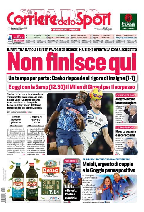 Il Corriere dello Sport apre in prima pagina con il pari tra Napoli e Inter: "Non finisce qui. Il pari tra Napoli e Inter favorisce Inzaghi ma tiene aperta la corsa scudetto. Un tempo per parte: Dzeko risponde al rigore di Insigne (1-1). E oggi con la Samp (12.30) il Milan di Giroud per il sorpasso". Sulla destra la sfida tra Atalanta e Juventus e le parole di Allegri. Spazio anche alla Roma che se la vedrà con il Sassuolo.