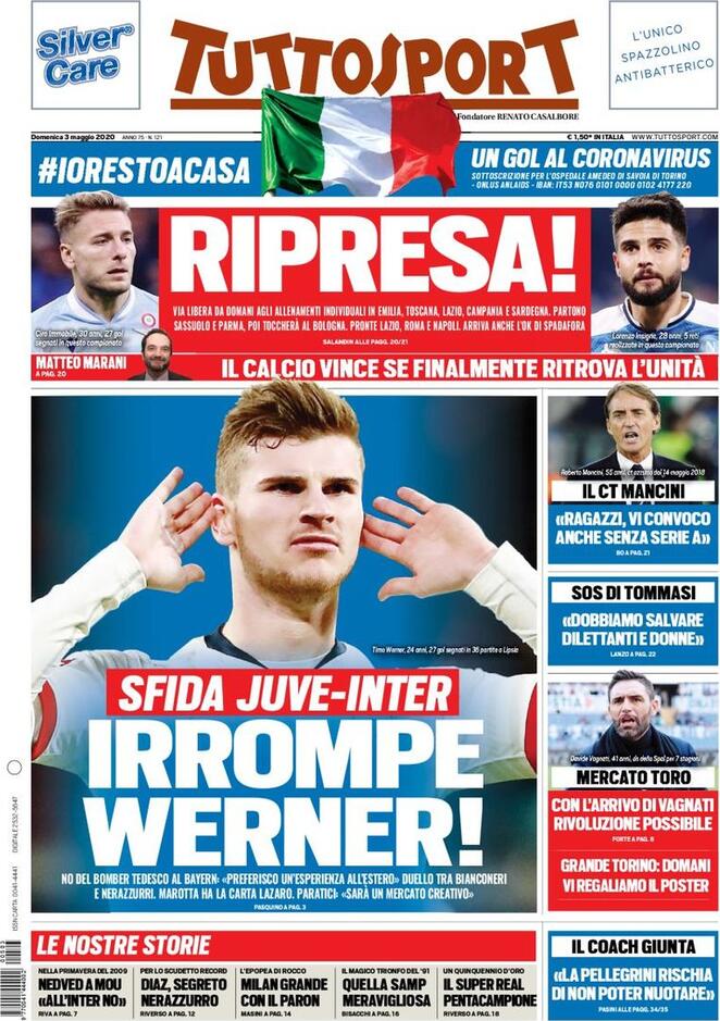 "Irrompe Werner". C'è il calciomercato a campeggiare in prima pagina su Tuttosport, con il duello Juve-Inter per l'attaccante del Lipsia che non andrà al Bayern Monaco. In taglio alto si parla del via libera agli allenamenti individuali di Campania, Toscana, Emilia, Lazio e Sardegna. "Pronte Lazio, Roma e Napoli", si legge in merito a una ripartenza.