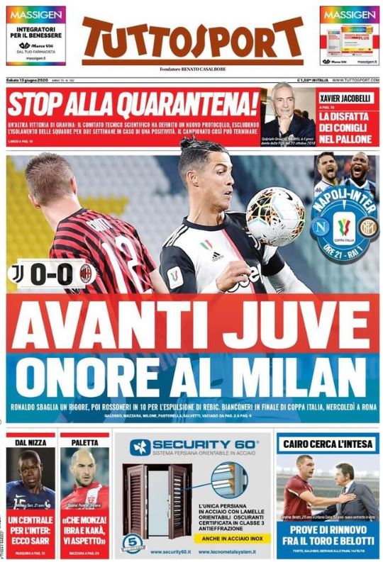 L'edizione odierna di Tuttosport apre stamane in edicola con il titolo: "Avanti Juve, onore al Milan": Ad approdare alla finale di Coppa Italia dopo la sfida di ieri sera sono i bianconeri di Maurizio Sarri, in virtù della rete segnata a San Siro all'andata. Il match dello Juventus Stadium termina 0 a 0 tra il silenzio di uno stadio deserto. Milan che gioca oltre settanta minuti in dieci per l'espulsione di Ante Rebic, che pochi secondi dopo il rigore fallito da Cristiano Ronaldo è stato allontanato dal campo per un'entrata pericolosa su Danilo. Ora i bianconeri attendono la vincente della sfida di stasera tra Napoli ed Inter.