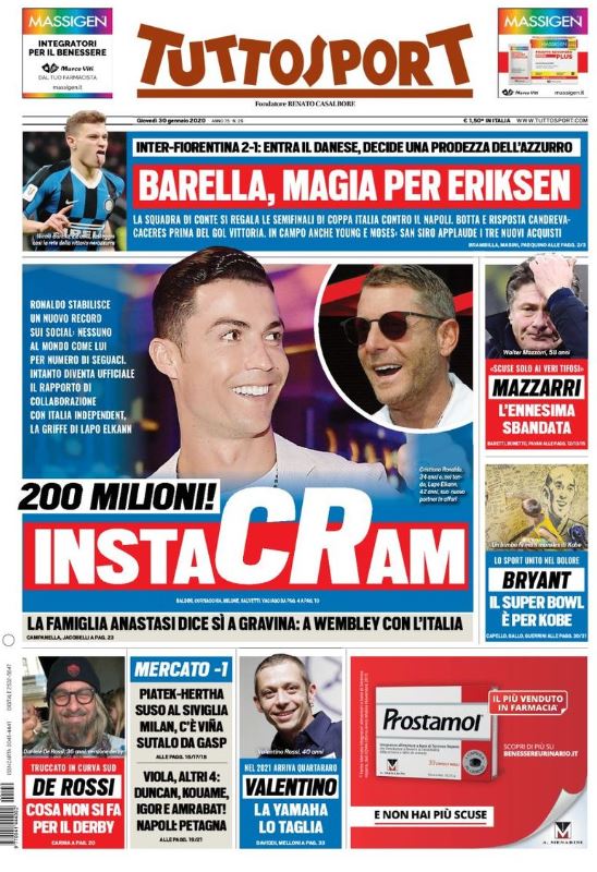 "Barella, magia per Eriksen" si legge in prima pagina sull'edizione odierna del quotidiano Tuttosport. Un bel gol del talento sardo regala all'Inter le semifinali di Coppa Italia contro il Napoli. In primo piano c'è ovviamente CR7...per quale motivo? Il portoghese ha stabilito un nuovo record: nessuno al mondo come lui per numero di seguaci (200 milioni!). Per questo il titolo è "Instacram".