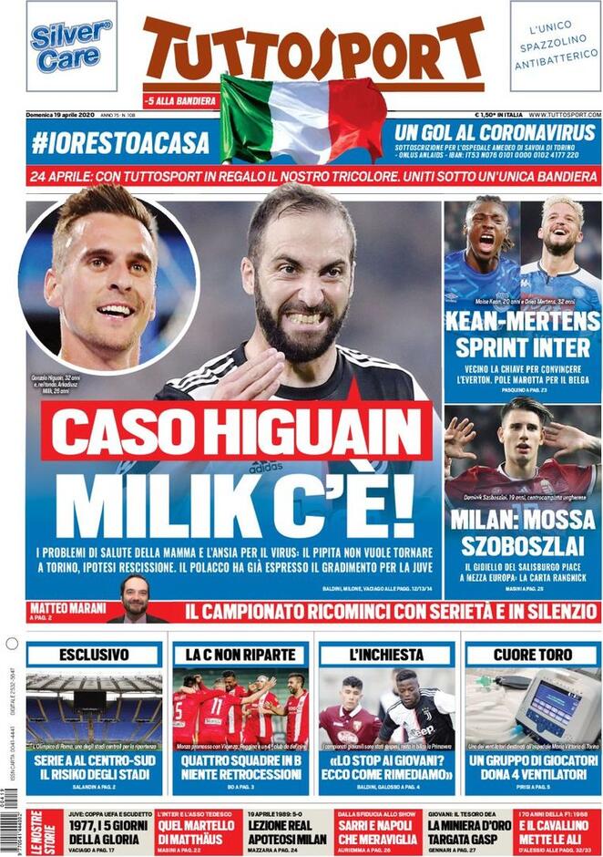 "Caso Higuain, Milik c'è", così intitola in prima pagina Tuttosport, i problemi di salute della mamma e l'ansia per il virus: il Pipita non vuole tornare a Torino, ipotesi rescissione. Il polacco ha giù espresso il gradimento per la Juve.