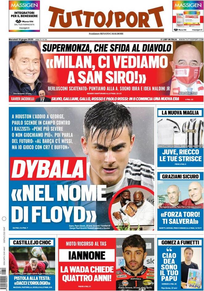 "Nel nome di Floyd", apre con le parole di Paulo Dybala la prima pagina di Tuttosport. A Houston l'addio a George, Paulo scende in campo contro i razzisti: "Pene più severe o non giochiamo più". Poi parla del futuro: "Al Barça c'è Messi, ma io gioco con CR7 e Buffon".