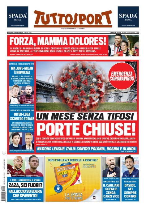 "Un mese senza tifosi. Porte chiuse!". Tuttosport in prima pagina apre con l'argomento dominante: l'emergenza Coronavirus. Si legge ancora: "Coppa Italia, si gioca solo Napoli-Inter ma Juve-Milan è rinviata!". Sempre di spalla: "Inter-Lega, scontro totale". In taglio alto un messaggio per la madre di Cristiano Ronaldo colpita da un ictus: "Forza, mamma Dolores".