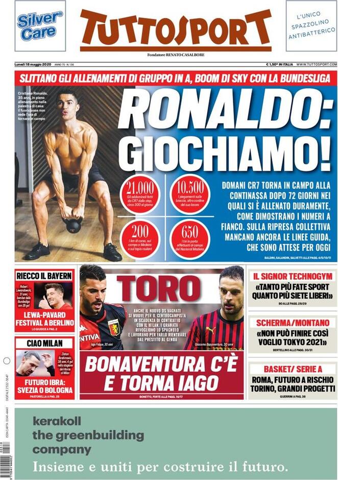 La prima pagina di Tuttosport apre con: "Ronaldo: giochiamo!", domani CR7 torna in campo alla Continassa dopo 72 giorni nei quali si è allenato duramente. Sulla ripresa collettiva mancano ancora le linee guida, che sono attese per oggi.