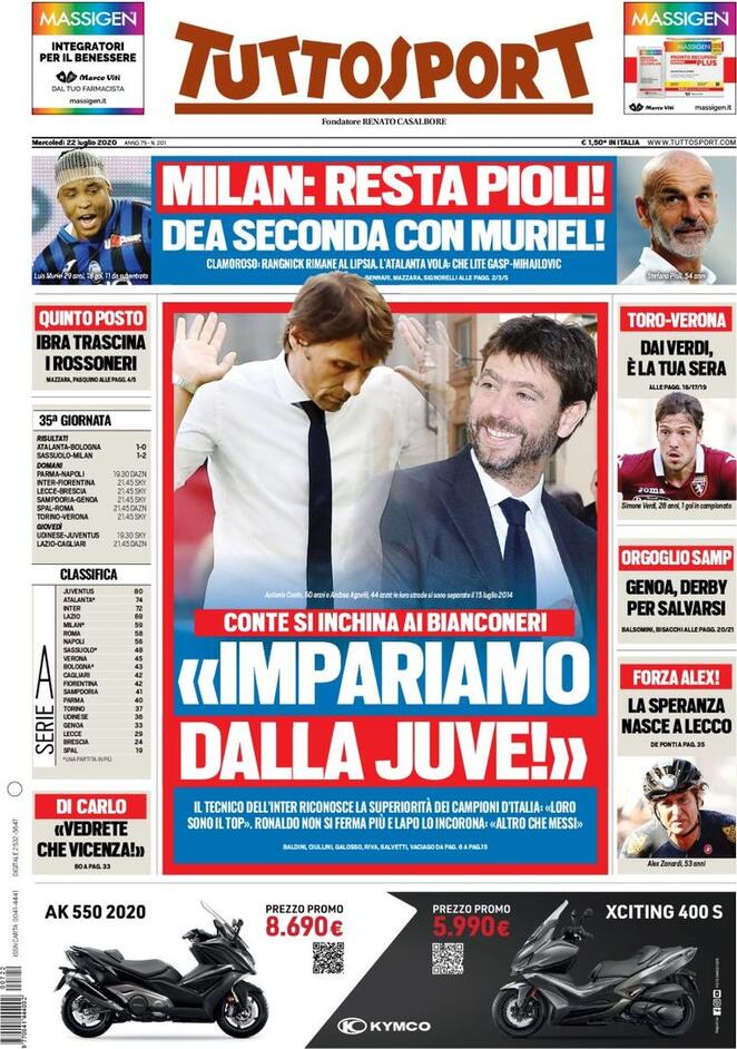"Impariamo dalla Juve" si legge in prima pagina sull'edizione odierna di Tuttosport. Sono le parole di Conte, allenatore dell'Inter, che si inchina ai bianconeri, ad un passo dallo scudetto. In alto 'Milan, resta Pioli' e 'Dea seconda con Muriel'. Di spalla il Torino impegnato contro il Verona: fiducia in Verdi.