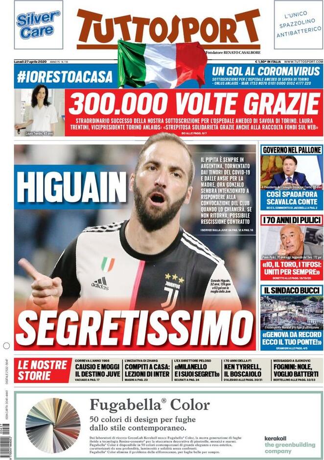 La prima pagina di Tuttosport apre con: "Higuain, segretissimo", il Pipita è sempre in Argentina, tormentato dai timori e dalle ansie per la madre. Ora Gonzalo sembra intenzionato a rispondere alla convocazione del club quando lo chiamerà. Se non ritorna, possibile rescissione contratto.