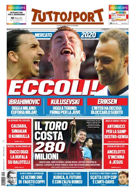 "Eccoli!" sulla prima pagina di Tuttosport con i focus su Ibrahimovic, Kulusevski e Eriksen, quest'ultimo che l'Inter vorrebbe bloccare per gennaio. Si legge del Torino che "costa 280 milioni". "Società sana, conti in regola, nessun debito, capitale giocatori in crescita", aggiunge il quotidiano. Di spalla: "Un difensore per l'Atalanta: Caldara, Simakan o Kumbulla". Infine la Premier League: "Ancelotti s'inchina a Jesus".