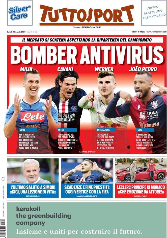 La prima pagina di Tuttosport apre con: "Bomber antivirus", il mercato si scatena aspettando la ripartenza del campionato. Milik-Juve, per il polacco braccio di ferro con il Napoli che preferisce trattare per soldi e non sulla base di scambi.