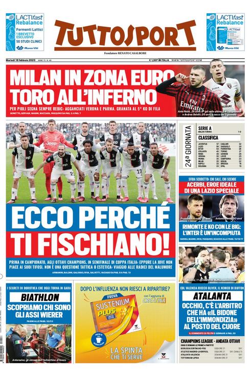 PRIMA PAGINA - Tuttosport: "Juve, ecco perché ti fischiano. Inter incompiuta"