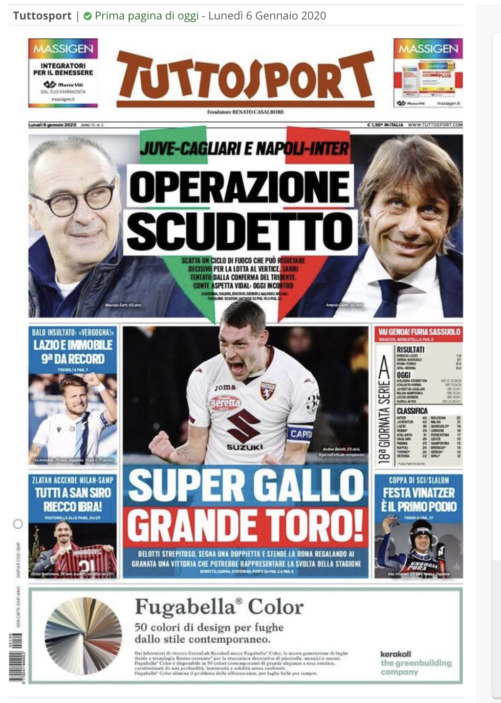 "Super Gallo, Grande Toro!". Si apre così l'edizione odierna di Tuttosport sulla vittoria di ieri sera dei granata sulla Roma per 0-2: "Belotti strepitoso, segna una doppietta e stende la Roma regalando ai granata una vittoria che potrebbe rappresentare la svolta della stagione".
