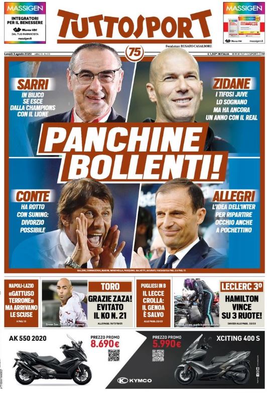 "Panchine bollenti!". Questo il titolo di apertura in prima pagina di Tuttosport questa mattina. Sarri è in bilico se esce dalla Champions League contro il Lione. I tifosi della Juventus sognano Zidane, ma ha ancora un anno con il Real Madrid. Conte ha rotto con Suning: il divorzio è possibile. L'idea dei nerazzurri per ripartire è Allegri, ma occhio anche a Pochettino.